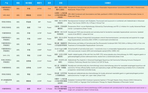在消化系统肿瘤领域,AG官网产品相关研究共入选2项口头报告、11项壁报和1项电子壁报,共14项研究。除卡瑞利珠单抗和阿帕替尼外,还有4篇阿得贝利单抗治疗消化系统肿瘤研究入选。HRS-4642、瑞拉芙普-α注射液(SHR-1701)等在研创新产品也有相应研究亮相。另有1项伊立替康脂质体(II)用于胰腺癌治疗的研究入选壁报。